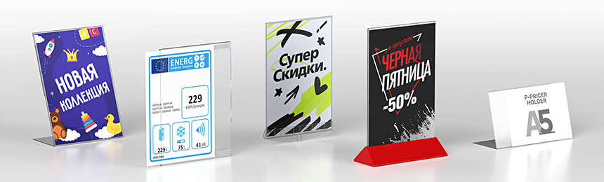 Ценникодержатели из листовых пластиков – акрила и ПВХ за счет отсутствия рамок и прозрачности материала имеют очень презентабельную внешность и отлично подходят для не продуктовой группы товаров. Их можно повесить на стену, поставить на стол или любую горизонтальную поверхность или использовать напольный вариант.