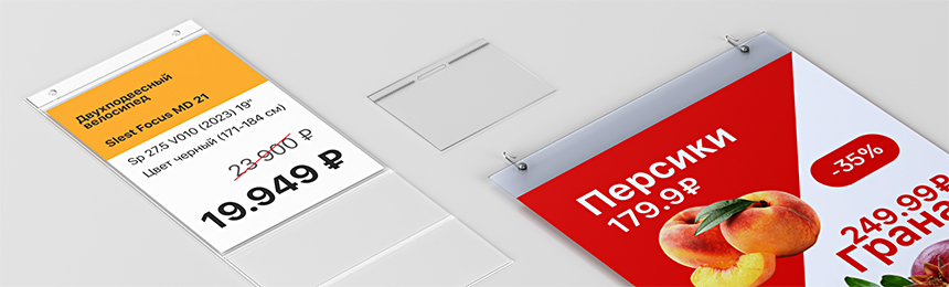 Акриловые карманы протекторы используют в комплекте с держателями на прищепках на вешалах в магазинах одежды и обуви и с держателями на подставках-ножках в витринах тех же магазинов. Они являются более премиальной на вид, альтернативой пластиковой рамке.