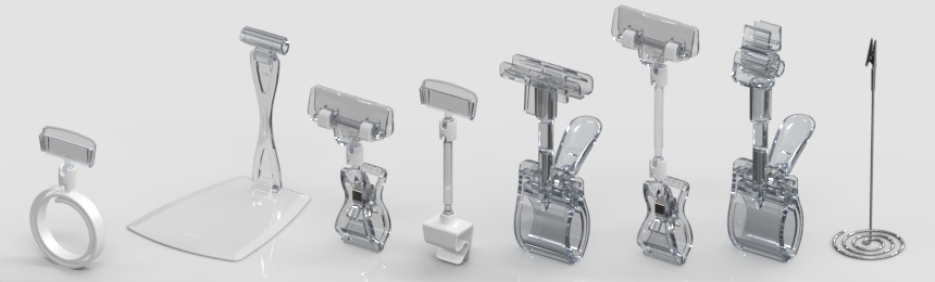 В линейке наших держателей есть две большие серии держателей ценников позволяющие создать любую модификацию ценников для различных задач в едином стиле, с помощью различных составных компонентов. Это серия шарнирных держателей ценников и держатели ценников системы ДЕЛИ.