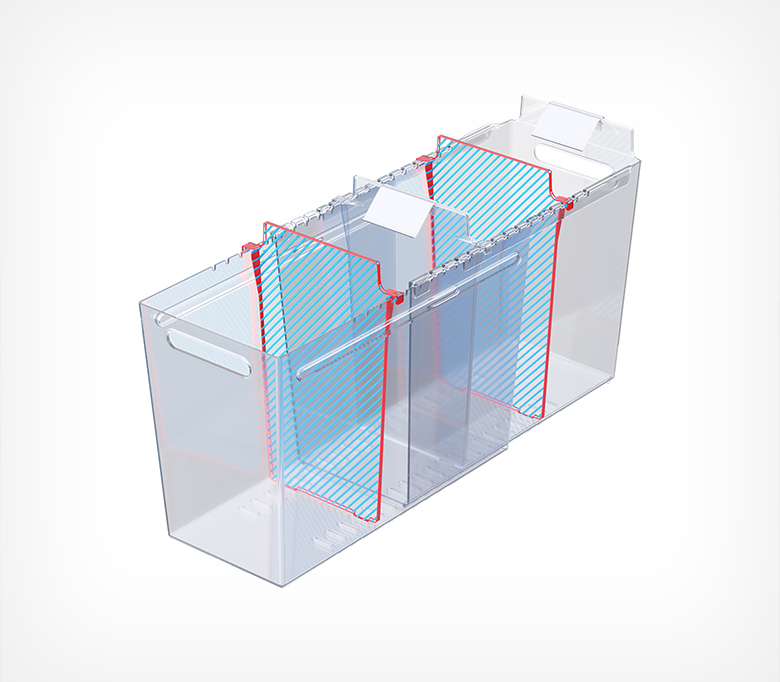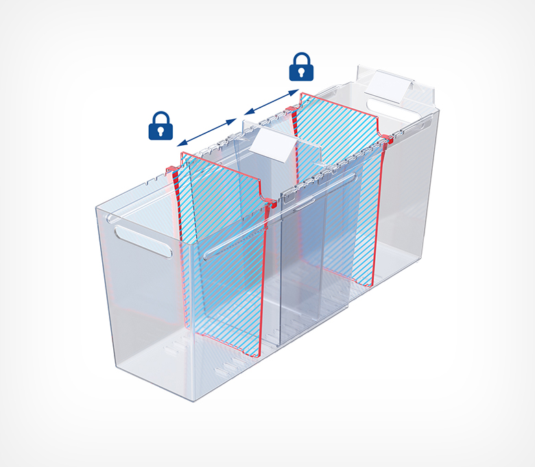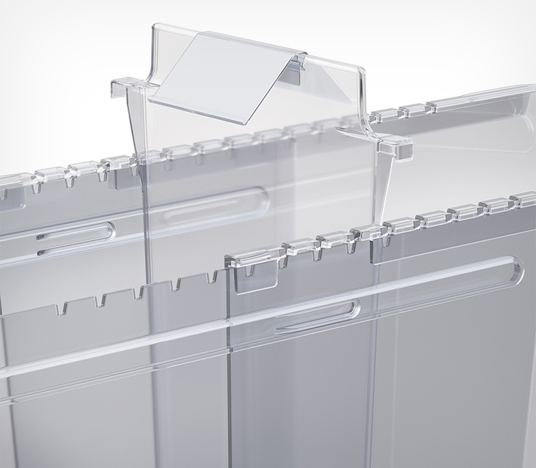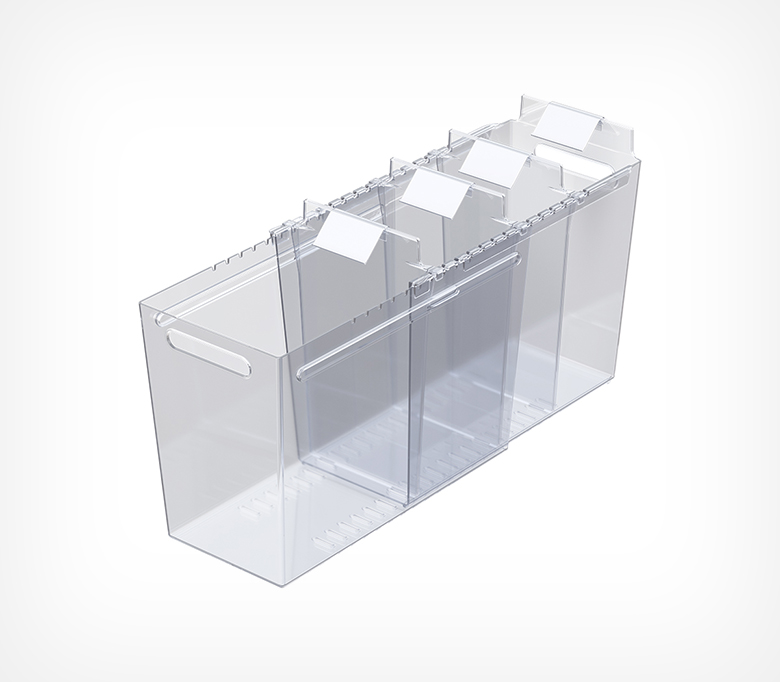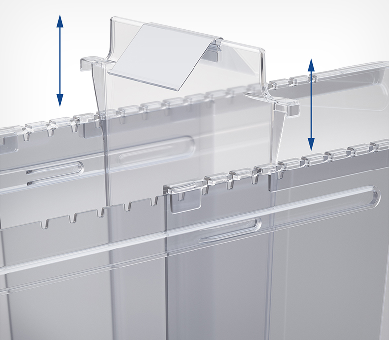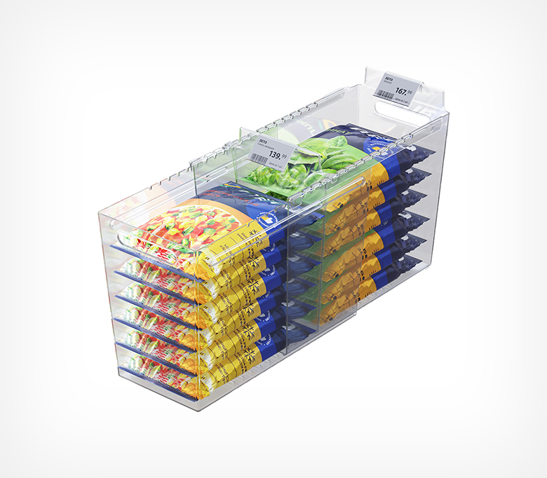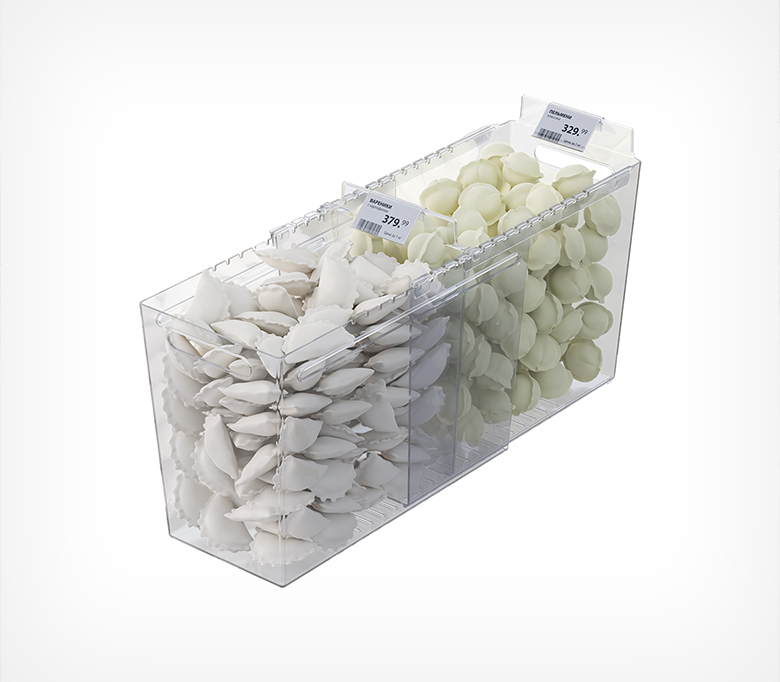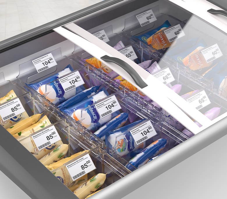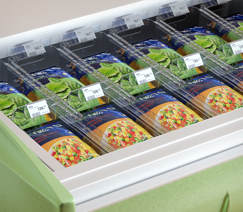 Раздвижной контейнер для идеального порядка в морозильных бонетах. Контейнер подходит для любых замороженных продуктов: в мягкой и твёрдой упаковке, а также на развес. Товары больше не смешиваются, а ценники всегда остаются на виду. Подвижные разделители позволяют адаптировать размеры ячеек под необходимый ассортимент за секунды. Специальный морозостойкий пластик выдерживает до -50°C и подходит для бонет глубиной до 700 мм (внутренняя глубина от передней до задней стенки).