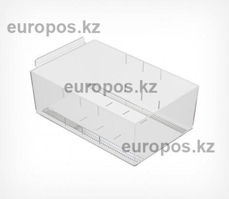 В комплекте поставляются две вставки-разделителя, которые позволяют делать аккуратную вертикальную выкладку и поддерживать порядок. Вставки можно установить в три положения. При желании можно доукомплектовать поперечной вставкой. На лицевую сторону накопителя можно прикрепить самоклеящийся ценникодержатель или разместить брендинг.