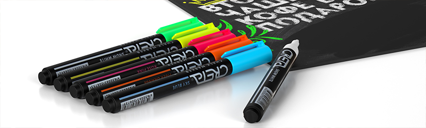 Для придания индивидуальности вашей торговой точке или акцентировании внимания покупателя на товаре могут использоваться цветные меловые маркеры. Маркеры могут быть водостойкими или перманентными и позволяют нанести надписи или рисунки на черных меловых табличках стенах, витринах и торговом оборудовании. Они сделают вашу торговую точку по-настоящему самобытной и запоминающейся. Пишите, рисуйте, создавайте и меняйте стиль и мессенджи для покупателей. Выбирайте свой цвет, толщину и вариант стирающейся или водостойкой надписи.
