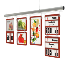 Как правило подвесные системы служат своеобразными цветовыми информационными маяками для визуального, привлечения потребителей. Они могут быть информационными носителями цен или рекламы; просматриваются на достаточном расстоянии от объекта размещения и уменьшающими загромождение торгового зала на уровне пола.