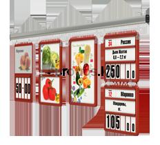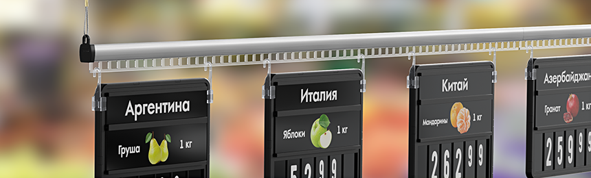 Чаще всего подвесные системы и профиля размещают в проходах в качестве навигации, над паллетной выкладкой для анонсирования акционных предложений, над овощными горками и морозильными боннетаами, для размещения ценникодержателей на товар.