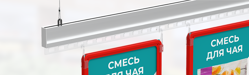 Подвесные системы повсеместно используются для зонирования пространства, оформления категорий, размещения ценников над паллетной выкладкой и морозильными ларями, подвешивания рекламных конструкций. Простота и эффективность подвесных систем давно зарекомендовала себя в магазинах различной направленности.