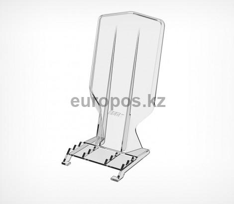 Чтобы презентовать товар покупателю в наклонном или вертикальном виде, сделать читабельной рекламную информацию на его упаковке, рекомендуется устанавливать на задние опоры. Это изделие из прозрачного пластика не отвлекает внимания покупателя от самого товара. Применяется в комплекте с ребристым профилем-основой.