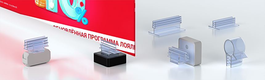 Держатели–захваты типа “акула” серии SUPERGRIP предназначены для фиксации различных стопперов, вывесок, шелфтокеров и других рекламных носителей толщиной до 3 мм. Свое народное наименование “акула” данная серия получила благодаря силиконовым зубам внутри держателя, которые надежно фиксируют рекламный материал. Одно из самых популярных направлений использования данных держателей.